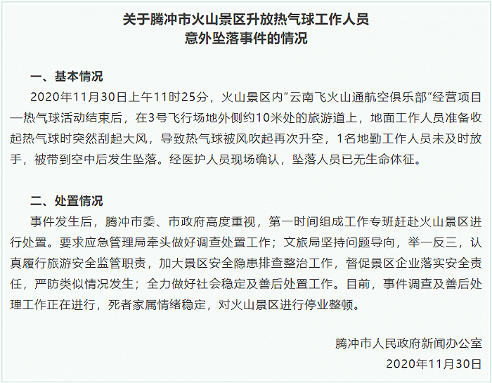 11月30日,云南腾冲火山国家公园内发生一起热气球坠亡事故。一名工作人员顺着热气球安全绳滑下,坠落地面身亡。当天,云南省腾冲市人民政府发布情况通报称,事件调查及善后处理工作正在进行,火山景区进行停业整顿。