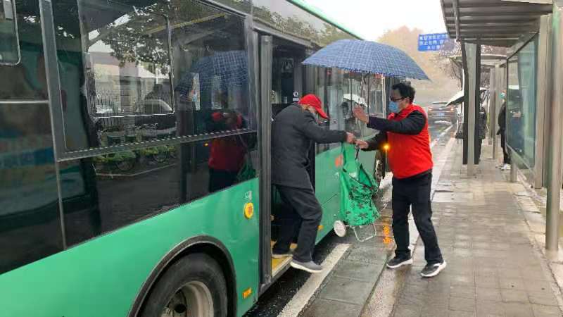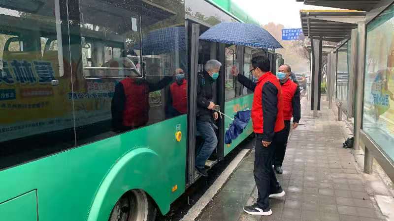 苏师傅党员志愿服务队在公交客流密集站、首末站,指挥疏导车辆,协助维持秩序,加强安全行车现场管理,确保乘客有序乘车。
