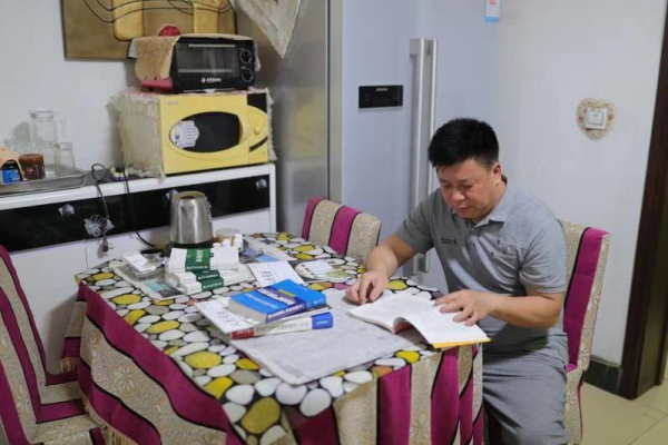 他早上六点多就到法院,准备开庭资料,中午匆忙回家给妻子喂饭,晚上下班把卷宗带回家接着干。