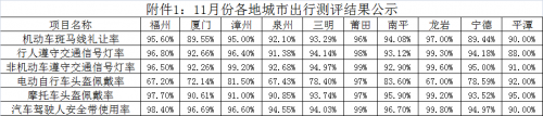 海峡网12月1日讯(海峡网记者 李牧晨 通讯员 刘君华)1日,记者从福建省公安厅交警总队获悉,11月份福建城市道路交通出行安全测评结果于今日公布,内容包括:机动车斑马线礼让率、行人遵守交通信号灯率、非机动车遵守交通信号灯率、电动自行车头盔佩戴率、摩托车头盔佩戴率、汽车驾驶人安全带使用率等六大类项目。