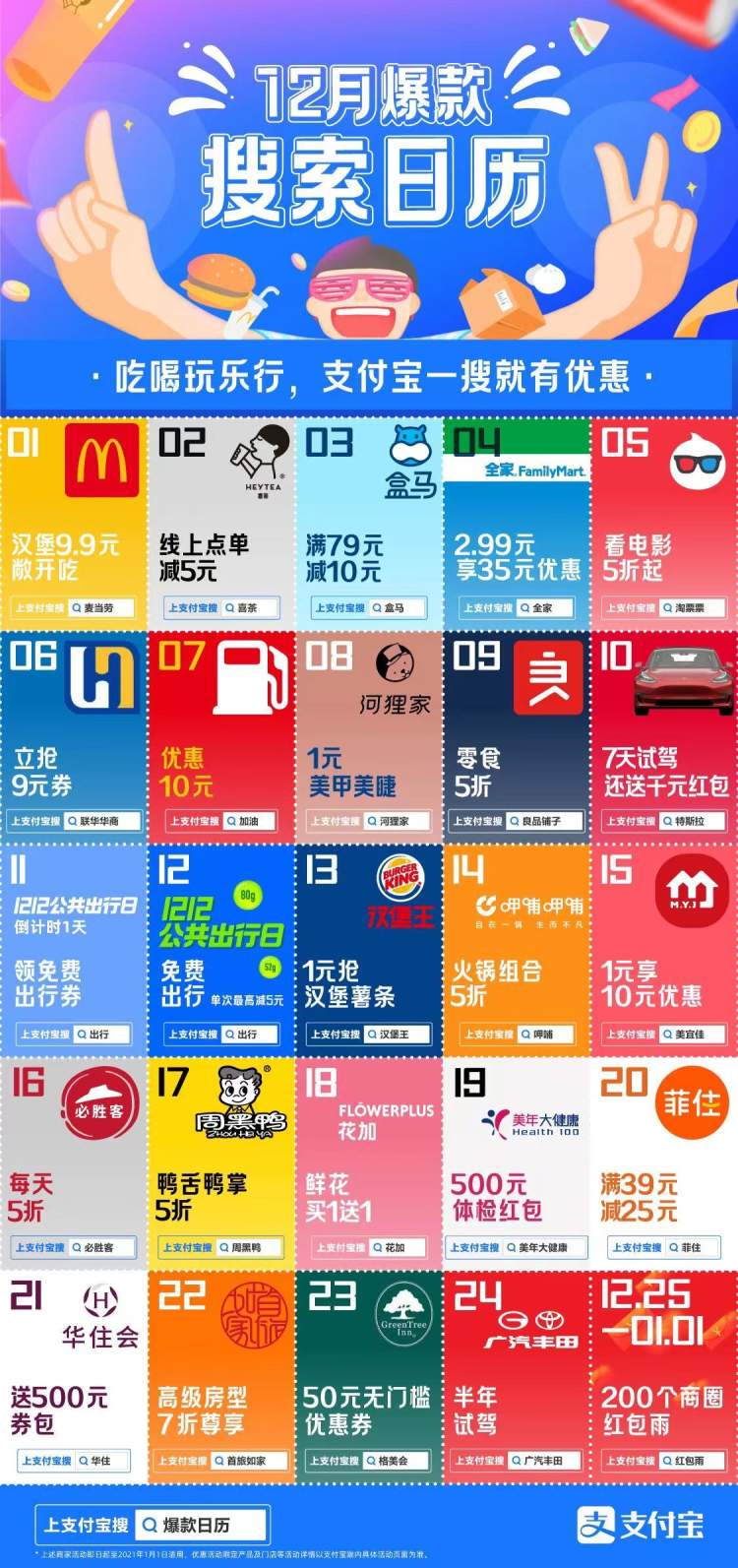 此外,还有近900万实体商家将在支付宝上开启年终大促,为消费者提供近百亿的消费券优惠。对于消费者来说,双十二活动期间只需要通过支付宝搜索“消费券”,就可以进入促销会场,每天领取到由商家联合支付宝提供的消费补贴、甚至低至1元的爆款特惠。