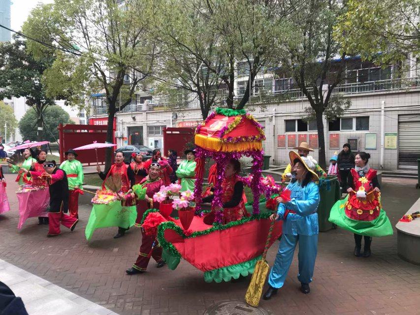 11月27日,在汉阳区江堤街江博社区辖区内,“采莲船民间艺术团”十余人的奶奶队伍将党的十九届五中全会精神以唱歌舞船的独特形式表现出来,引来了居民朋友们的驻足围观跟阵阵掌声。现场观众表示,这样的形式不仅耳目一新,而且通俗易懂,让大家及时学习并坚决贯彻全会精神,让全会精神深入人心。