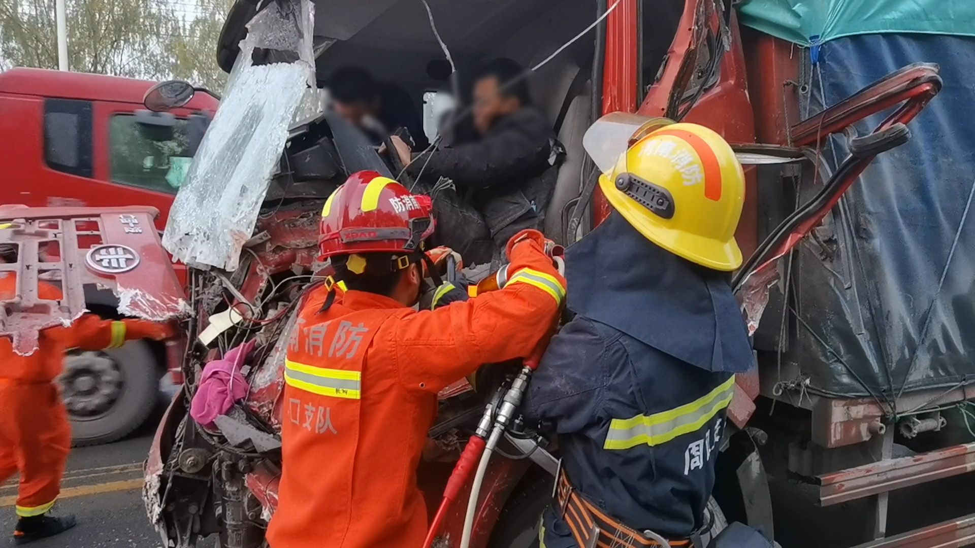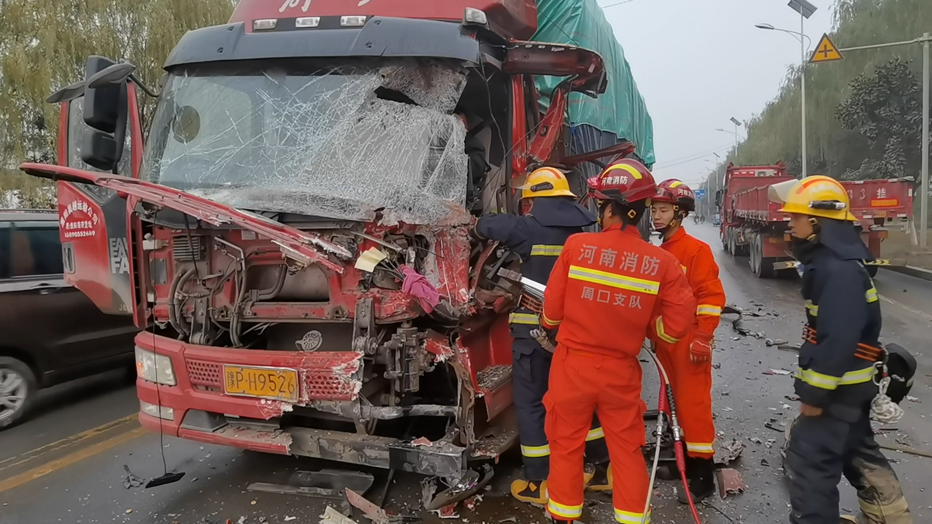 11月30日16时54分,周口市消防救援支队淮阳大队指挥中心接到报警称:周口市淮阳区北二环中段发生一起交通事故,一名司机被困车内,急需救援。接到报警后,淮周路中队立即出动2辆消防车、10名指战员赶赴现场救援。