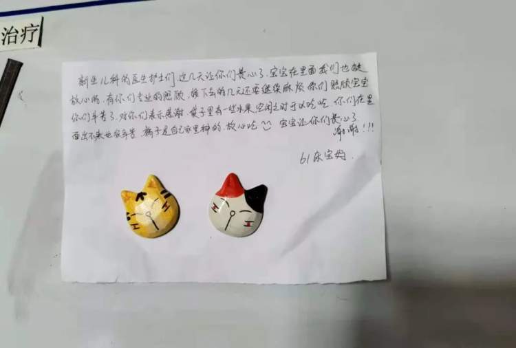 “美女”妈妈特意送了自己家种的橘子进来,附的纸条写到:“这几天让你们费心了!宝宝在里面我们也挺放心的。有你们的专业照顾,接下来的几天还要继续麻烦你们照顾宝宝。橘子是自己家里种的,放心吃。”娇娇说:“再忙再累,抱着宝宝心就化了,被治愈了!”