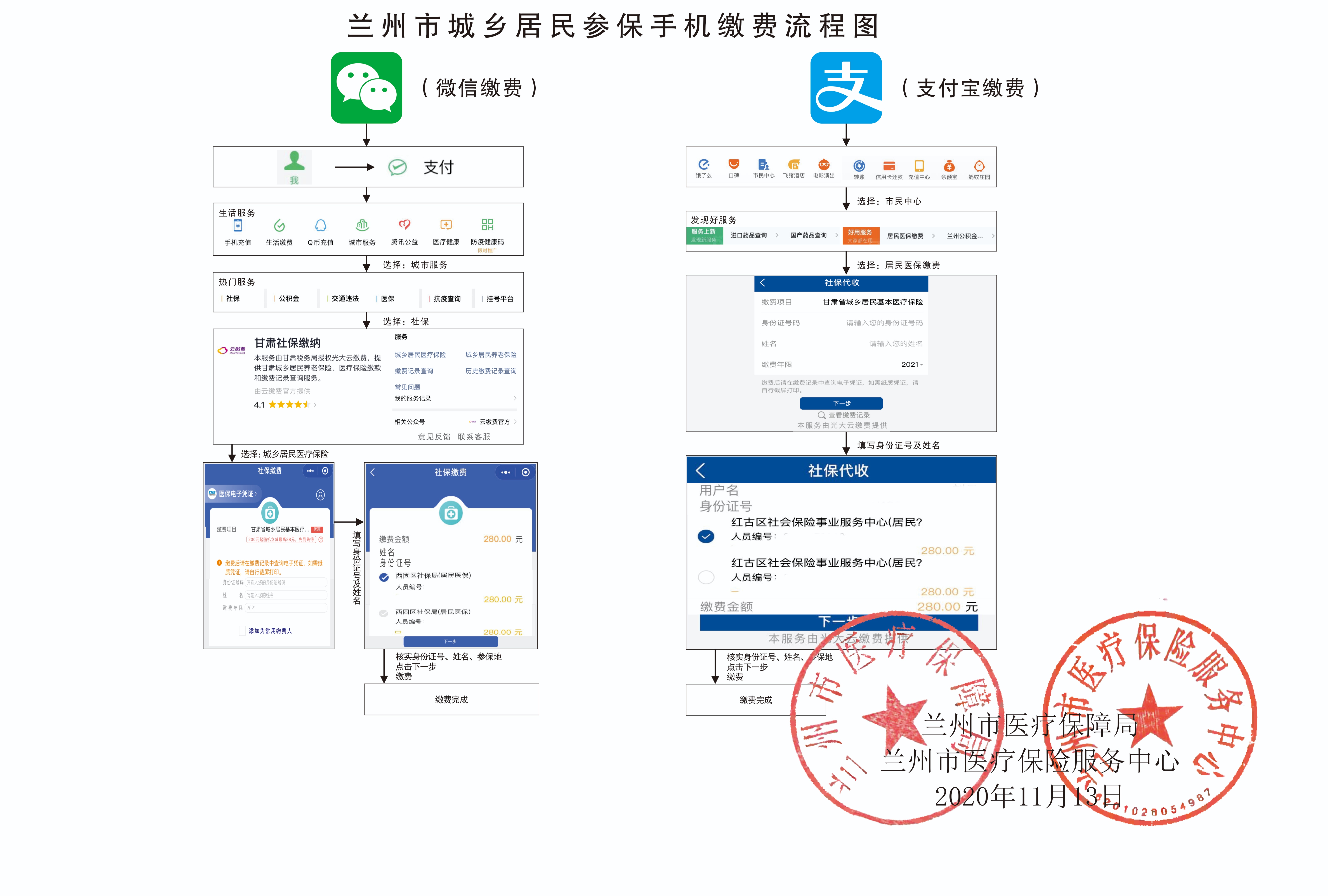 兰州市医保局提醒,为了避免对您的医保待遇享受带来不便,请您在缴费时务必确认参保地。1.指定商业银行缴费,城乡居民可持有效身份证或户口本,到兰州市内农业银行、农村信用社等商业银行的各代办营业网点柜台缴纳。2.自助缴费,①合作商业银行线上缴费。②微信、支付宝缴费流程如下: