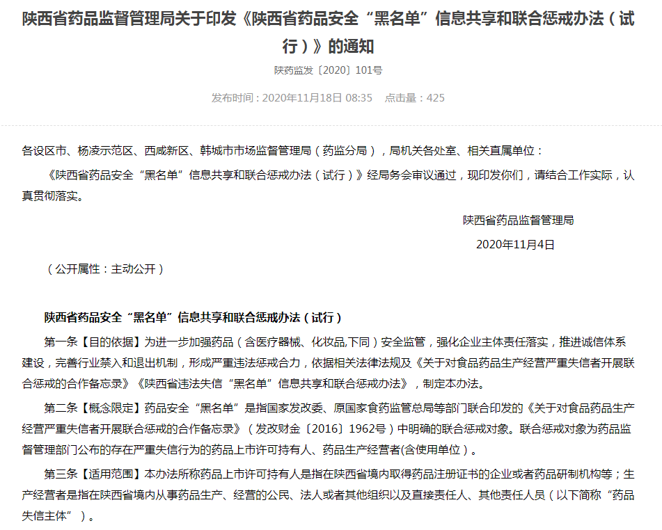 日前,陕西省印发关于《陕西省药品安全“黑名单”信息共享和联合惩戒办法(试行)》的通知,黑名单将面向社会公布,包含药品监督管理部门发布的存在严重失信行为的药品上市许可持有人、药品生产经营者(含使用单位)的基本信息及列入失信“黑名单”的事由、处罚结果、移出日期等。