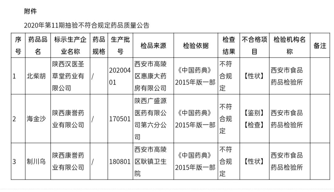以上检验依据为《中国药典》2015年版一部。对本次抽验结果不符合规定药品涉及的相关单位,相关市(县、区)药品监管部门已采取必要控制措施,正在依据有关法律法规进行查处。(西安报业全媒体记者 高瑞 王江黎)