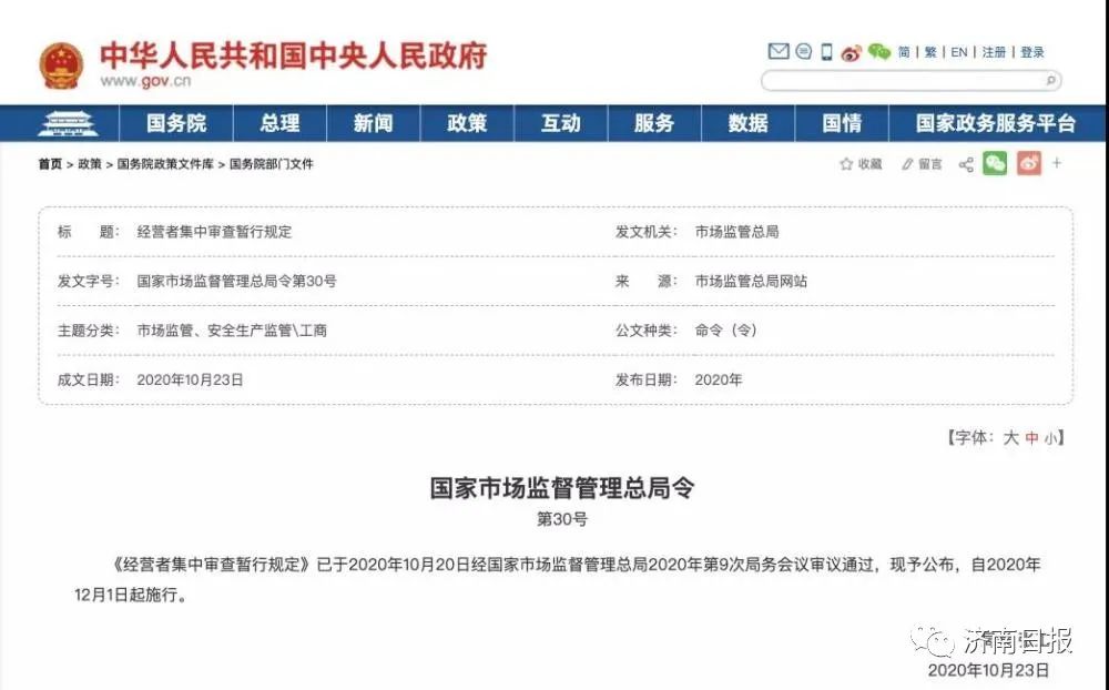 《经营者集中审查暂行规定》已于2020年10月20日经国家市场监督管理总局2020年第9次局务会议审议通过,自2020年12月1日起施行。《规定》共六十五条,其中明确,国家市场监督管理总局负责经营者集中反垄断审查工作,并对违法实施的经营者集中进行调查处理。市场监管总局根据工作需要,可以委托省、自治区、直辖市市场监管部门实施经营者集中审查。