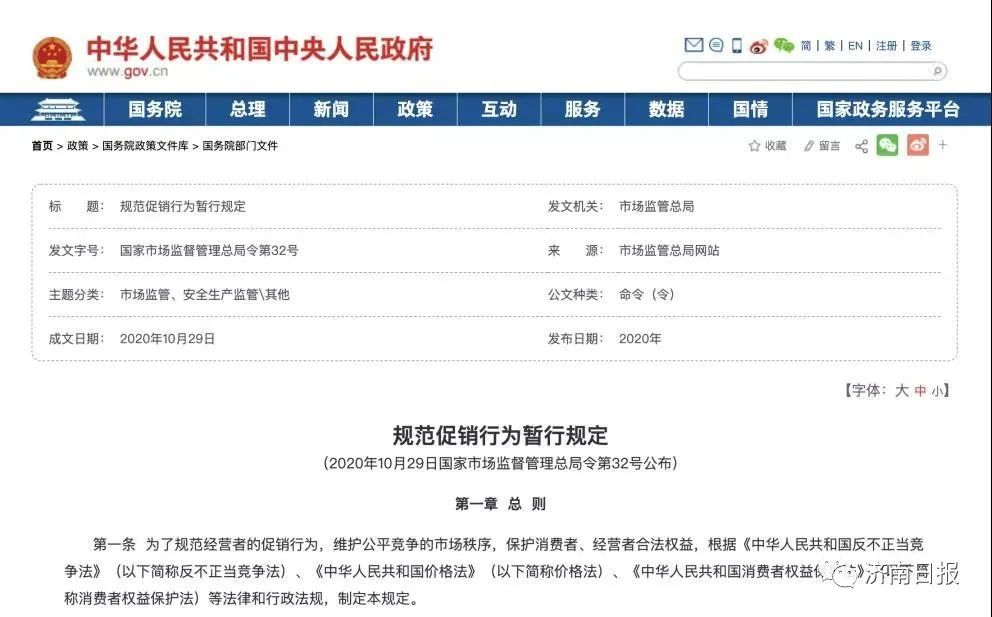 11月5日,市场监管总局公布《规范促销行为暂行规定》,其中规定经营者折价、减价,应当标明或者通过其他方便消费者认知的方式表明折价、减价的基准。通过积分、礼券、兑换券、代金券等折抵价款的,应当以显著方式标明或者通过店堂告示等方式公开折价计算的具体办法。