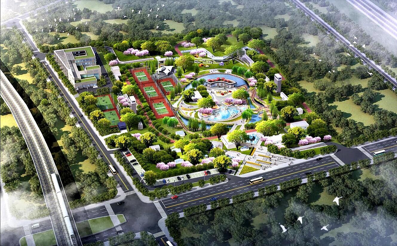 设计图显示,公园有一条环形健身跑道,设计了入口迎宾园、休闲娱乐园、体育运动园、湿地科普展示园、阳光活动园,景观设计了花田、草坡,还有生态网球场和羽毛球场。