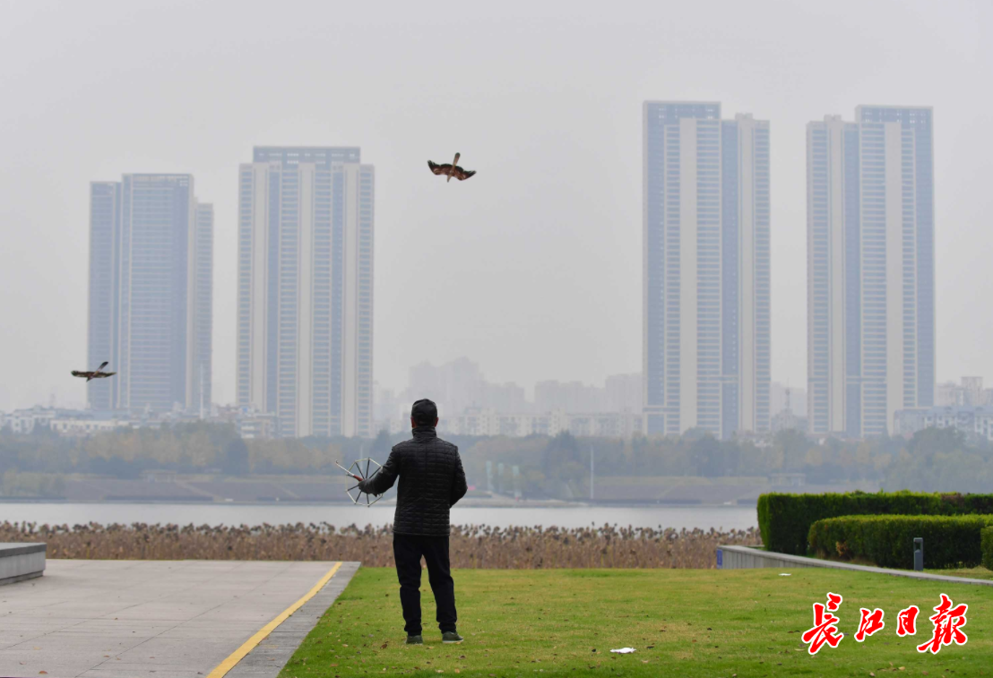 12月1日清晨,月湖湖畔一片朦胧,一位风筝爱好者在湖边放飞“盘鹰”。记者李永刚 摄