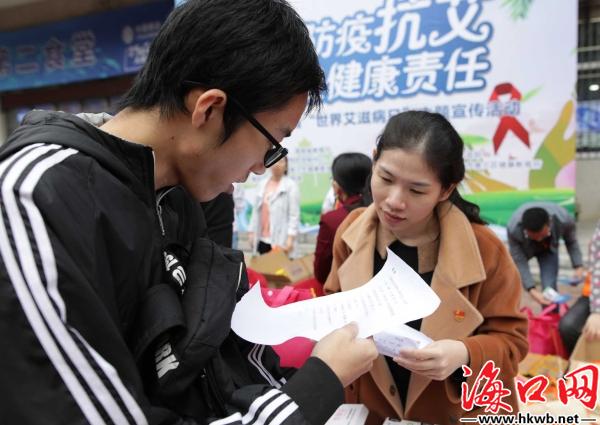 当天上午,在海南大学第二食堂外的宣传墙附近,海南省防艾工作人员向大学生们发放宣传折页,回答大学生提出的各类问题,并引导他们观看现场布置的病毒模型科普展览。