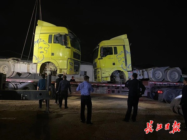 当晚,为彻底消除安全隐患,专班民警连夜组织起重车辆及平板车辆,将2辆逾期未年检且脱保、脱管的重型货车,连夜启运回汉。