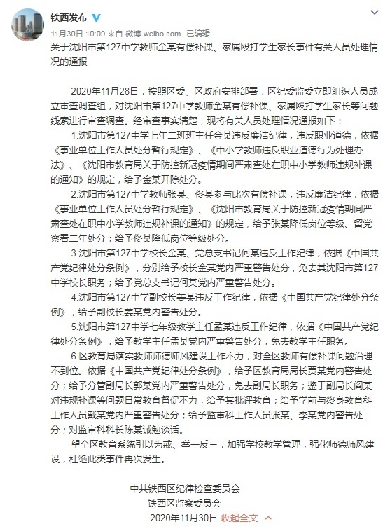 前不久,沈阳市第127中的一位金姓老师怀疑家长举报其有偿补课,在家长解释时,金老师丈夫出现将家长打伤。事件曝光后,引发舆论关注。近日,继当地联合工作组调查确认违规有偿补课、打伤学生家长行为属实之后,当地纪委监委迅速对问题线索进行审查调查,作出了涉事教师被开除、校长被免职等处分决定,并严肃追究了相关部门治理有偿补课问题不到位的责任。