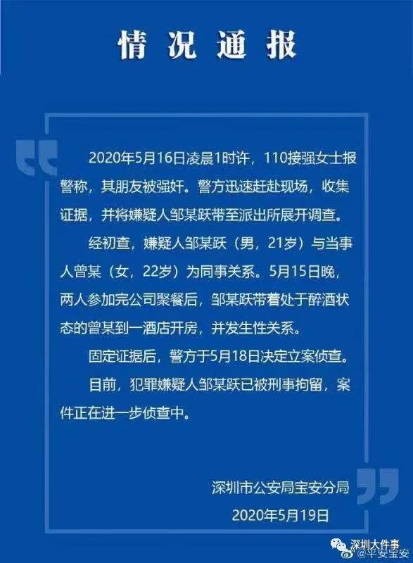 5月19日,深圳市公安局宝安分局通报,5月16日凌晨1时许,110接强女士报警称,其朋友被强奸。警方迅速赶赴现场,收集证据,并将嫌疑人邹某跃带至派出所展开调查。