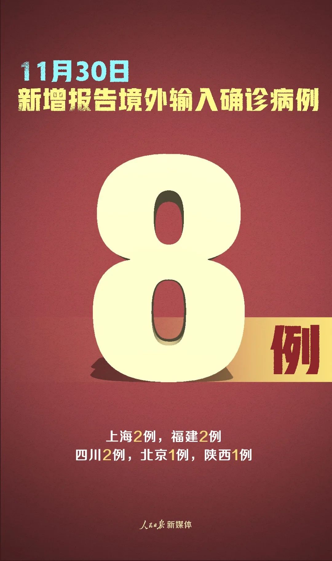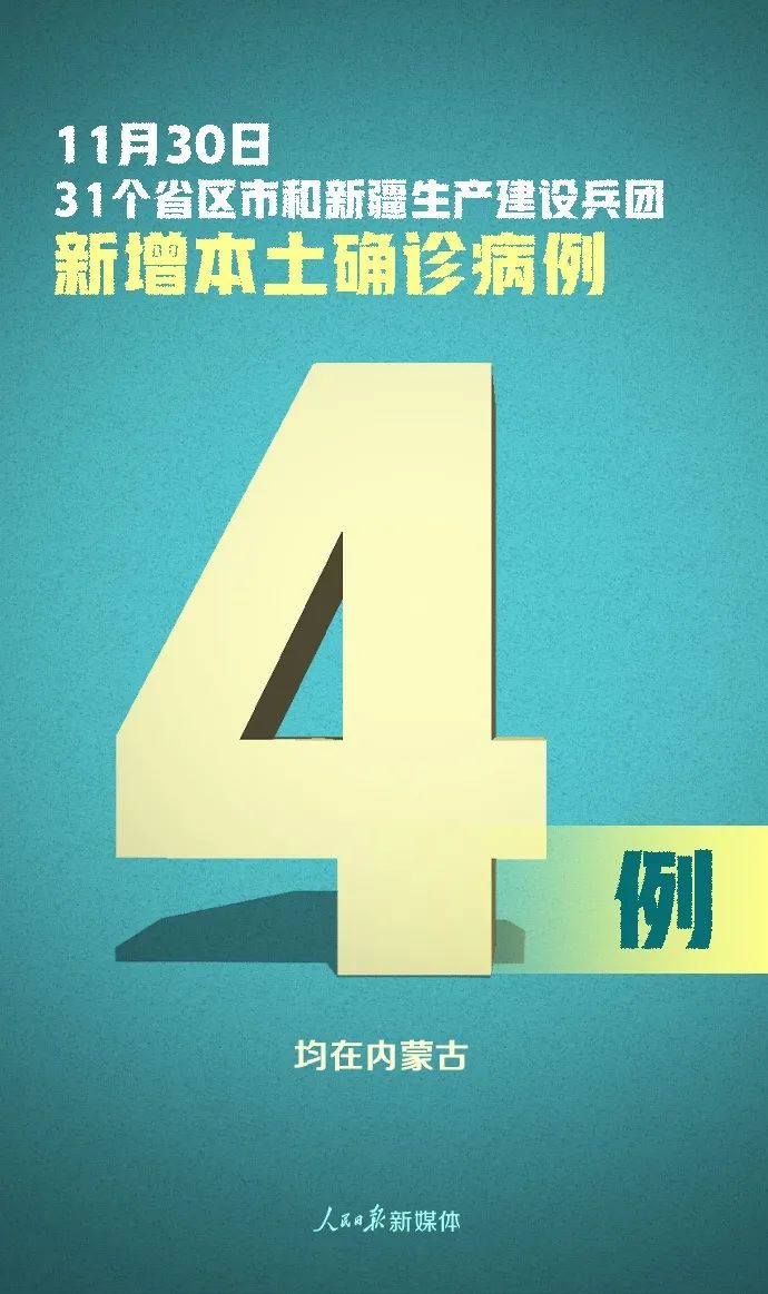 11月30日0—24时,31个省(自治区、直辖市)和新疆生产建设兵团报告新增确诊病例12例,其中境外输入病例8例(上海2例,福建2例,四川2例,北京1例,陕西1例),本土病例4例(均在内蒙古);无新增死亡病例;无新增疑似病例。