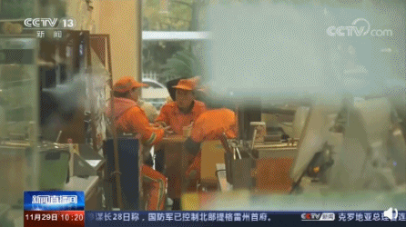中午12点,忙活了7个小时的闫征因和工友总算可以歇一会儿了。以往他们总要带着饭菜走到1公里以外的驿站热饭休息,这几天,他们方便多了。地扫到哪儿,就能就近找到接纳他们休息的商家。