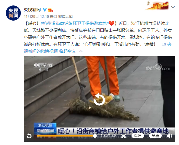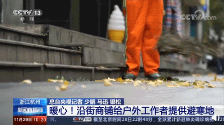 近日,浙江杭州气温持续走低。天城路不少便利店、快餐店等都在门口贴出一张服务单,向环卫工人、外卖小哥等户外工作者敞开大门。这些店铺,有的提供开水、歇脚地,有的专门提供饭菜打折优惠。有环卫工人说:“心里感到暖和,干活儿也有劲。”点赞!