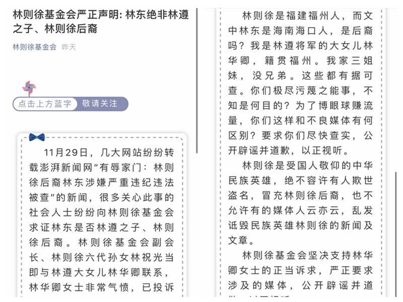 11月29日晚,林则徐基金会官方微信号严正声明:林东绝非林遵之子、林则徐后裔。