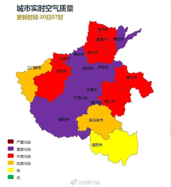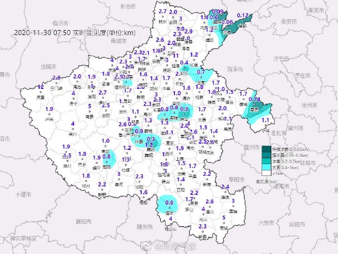 河南省气象台2020年11月30日05时40分继续发布大雾黄色预警:预计未来6小时内,濮阳、开封、商丘、许昌、漯河五地区和周口、驻马店两地区北部以及南阳地区西部部分地区将出现能见度小于500米的雾,局地能见度小于50米。请注意防范!