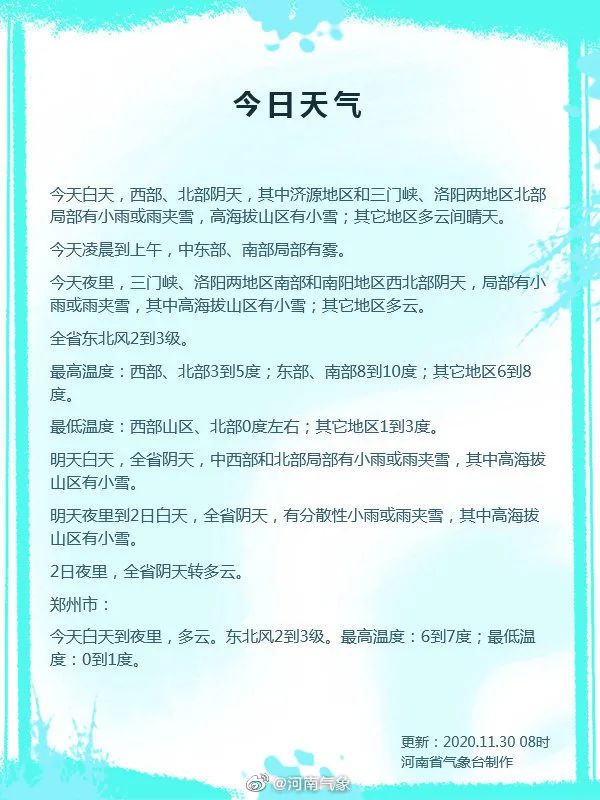 3、1号夜里到2号,全省有大范围的雨雪过程,以小雨或雨夹雪为主,高海拔山区会有小雪出现,雨雪量不大,但是由于气温低,还要格外注意路面湿滑带来的不便。