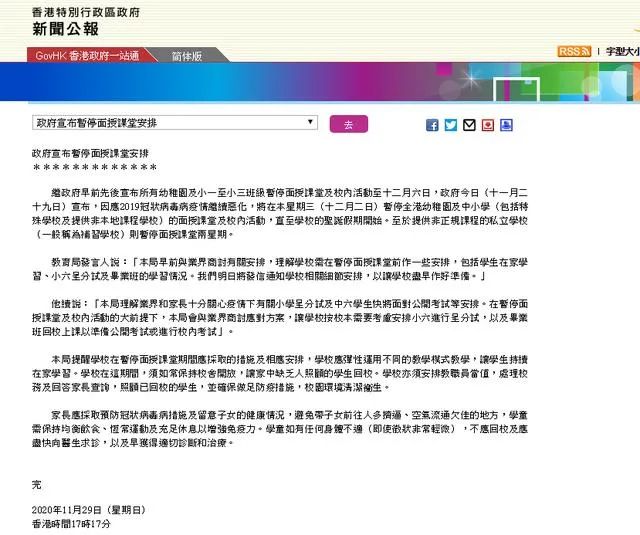 香港特区政府宣布,因应新冠疫情持续恶化,将从12月2日起,暂停全港幼稚园及中小学(包括特殊学校及提供非本地课程学校)的面授课堂及校内活动,直至学校的圣诞假期开始。