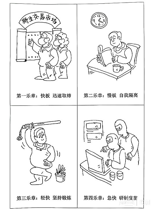 四格漫画布局犹如一幅画卷,以逻辑线串联缓缓展开,抛出问题,平面展开,突出矛盾,制造主题高潮。比如四格漫画《攻克疫情交响曲》,第一幅《第一乐章:快板,迅速取缔》抛出问题所在,第二幅《第二乐章:慢板,自我隔离》平面展开问题,第三幅《第三乐章:轻快,坚持锻炼》突出问题矛盾,第四幅《第四乐章:急快,研制疫苗》营造整篇高潮。
