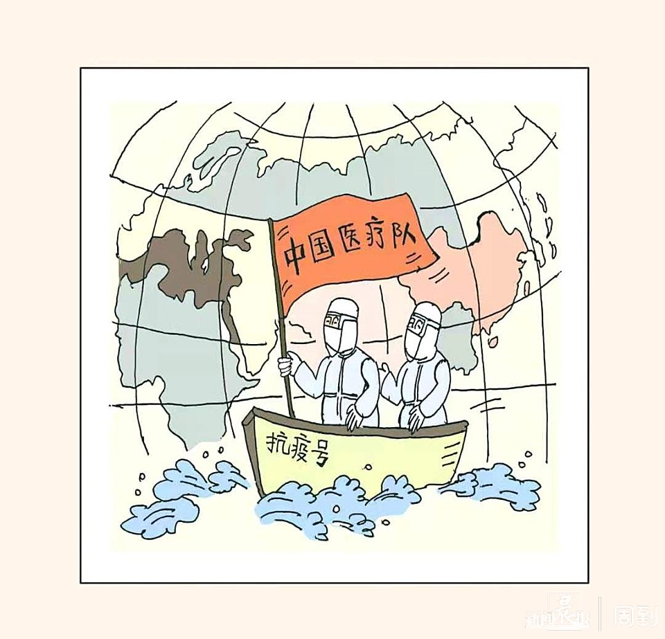 在创作漫画的过程中,曹钟强坚持从医生的专业视角出发,要求内容真实、专业、幽默,形式上采用单幅漫画和四格漫画两种。单幅漫画画面直白,因此要求内容有趣、主题鲜明,能体现对新冠肺炎的深度思考。比如,单幅漫画《山川异域,封疫同舟》表现了疫情流行时期,各国应该携起手来,守望相助,共同抗疫。