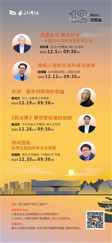 湖北日报讯 (记者王晶、通讯员刘虹)2020年的最后一个月,湖北省图书馆“长江讲坛”为读者准备了5场思想聚会。