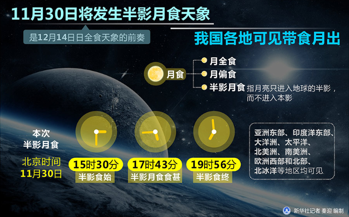 天文专家介绍,一次半影月食天象将于11月30日在天宇发生,这也是12月14日日全食天象的前奏,届时,如果天气晴好,我国各地可见带食月出。