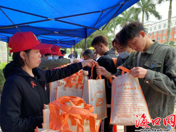 当天,记者在活动现场看到,美兰区卫健委、区疾病预防控制中心、区健康教育所等单位工作人员及海口经济学院学生志愿者向该校学生发放宣传页及安全套、购物袋、纸巾、指甲钳、文化衫等小礼品,向学生们介绍艾滋病相关知识、预防措施及治疗方法,讲解国家防控艾滋病的优惠政策,提醒大家要洁身自好、小心防范艾滋病,但无需过于恐慌,不要谈“艾”色变。