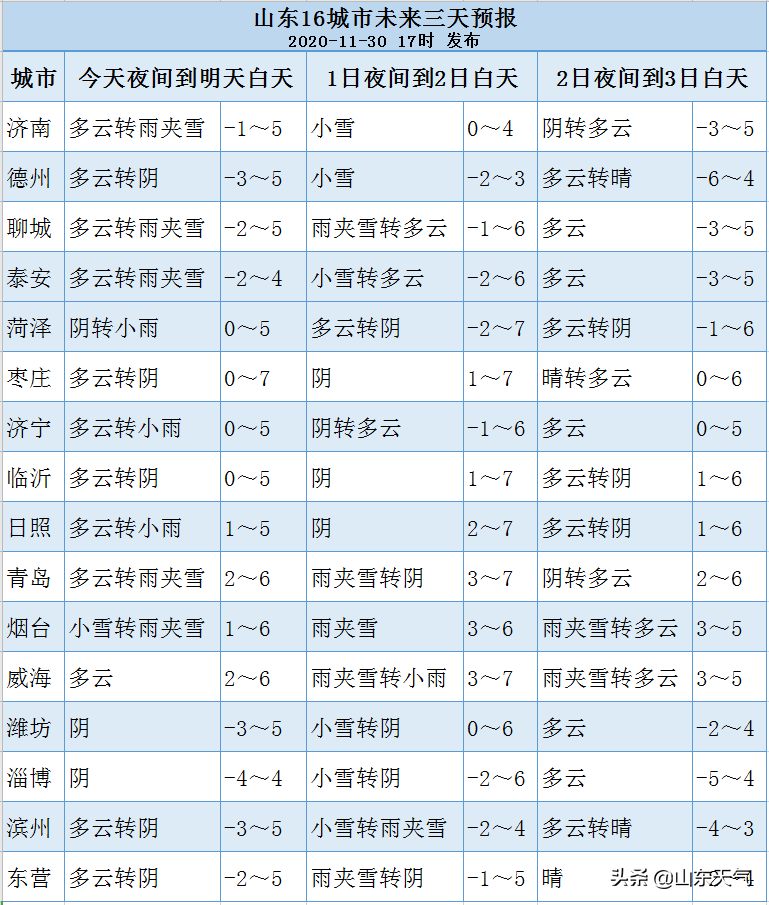 全省天气多云转阴有小雨雪。鲁西北地区北风转南风2~3级,其他地区北风3~4级。