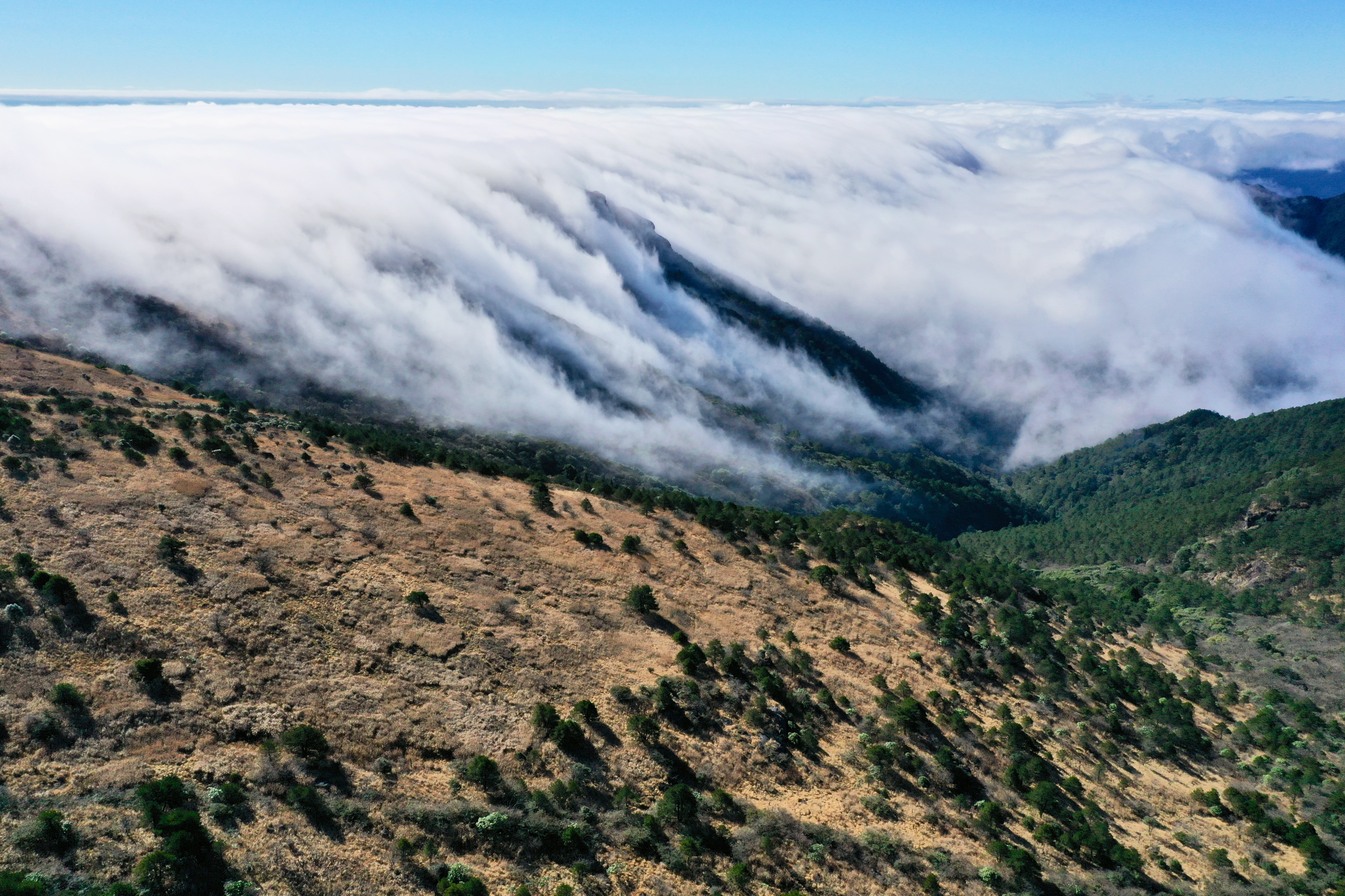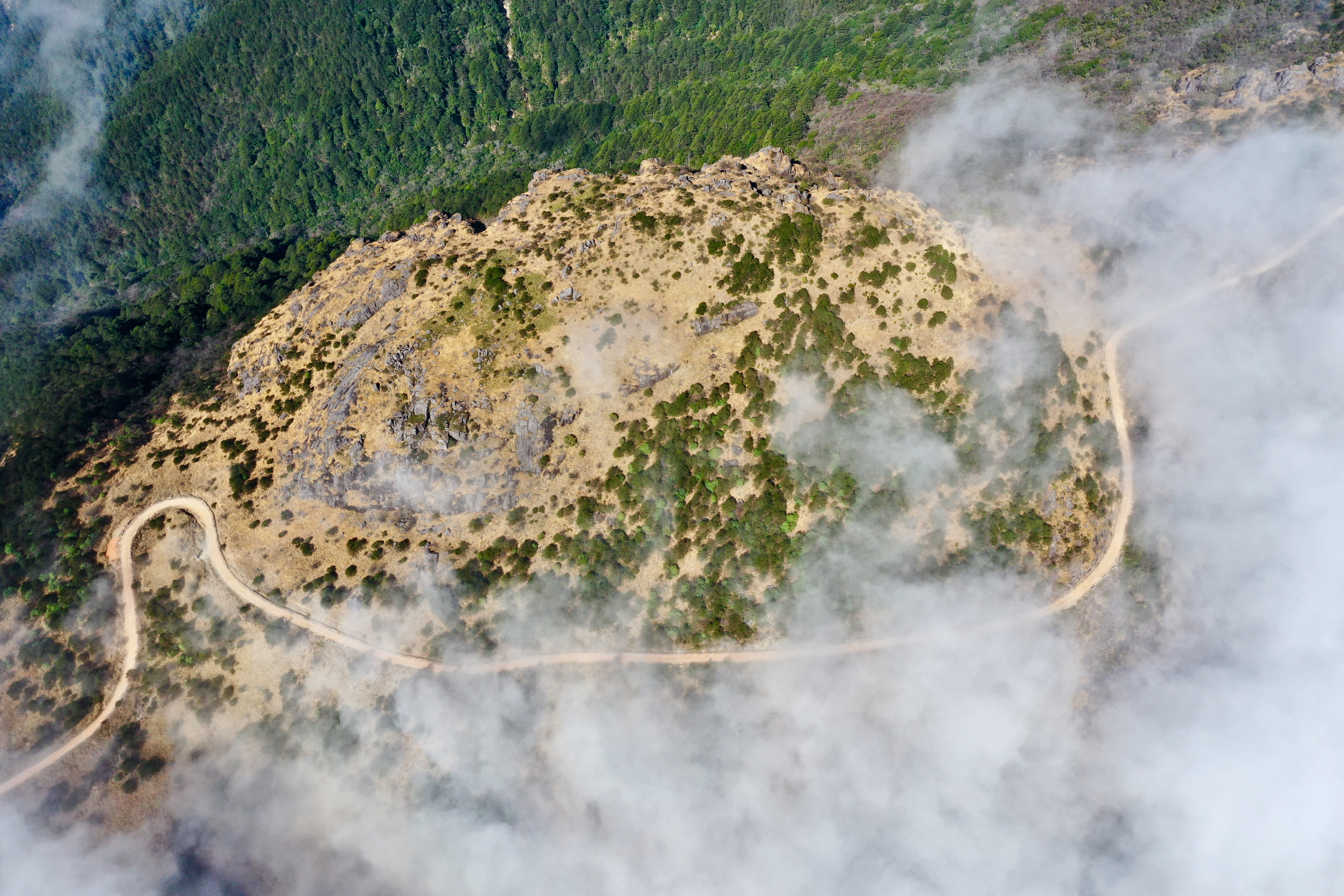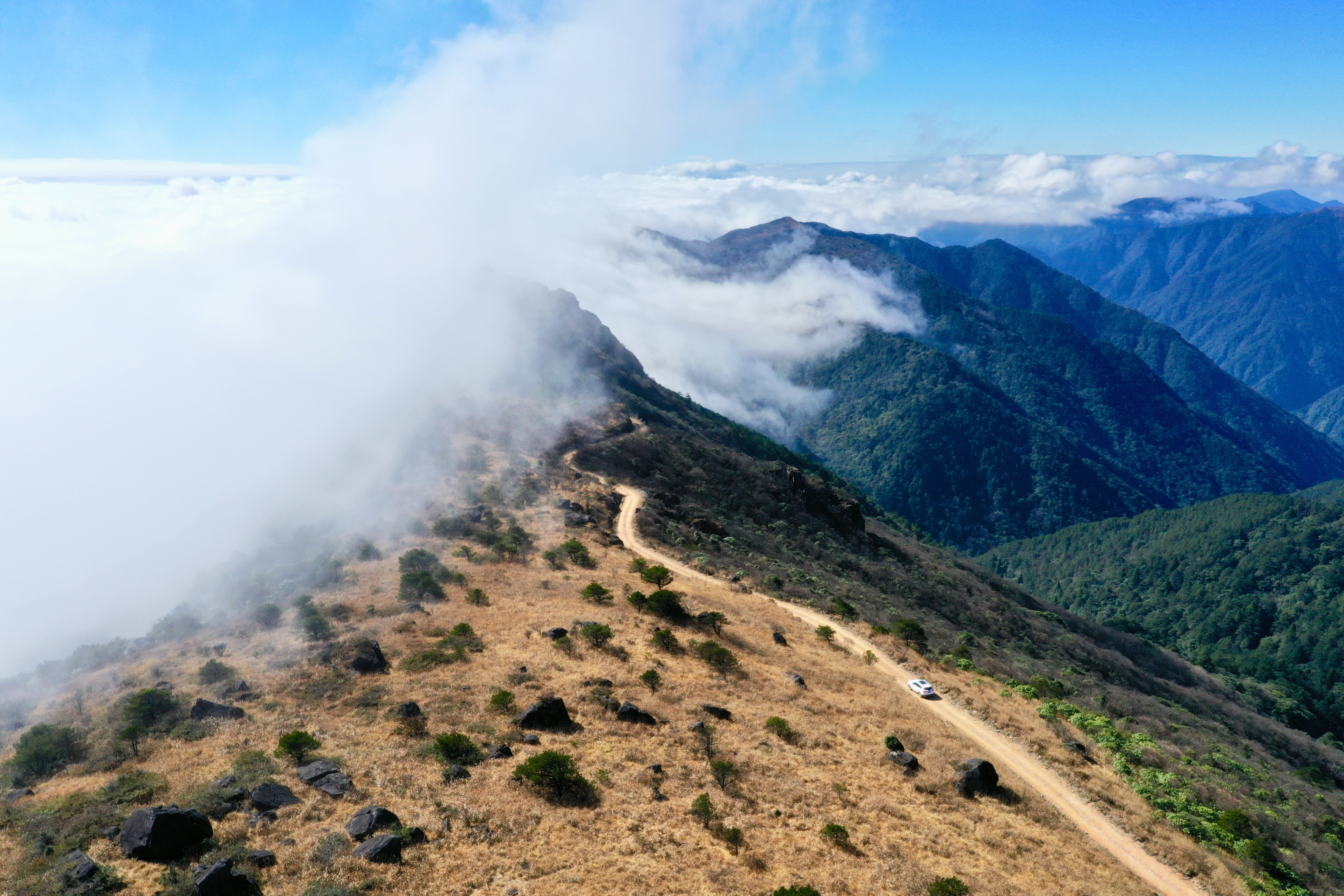 12月1日,车辆行驶在云雾缭绕的武夷主峰黄岗山顶(无人机照片)。