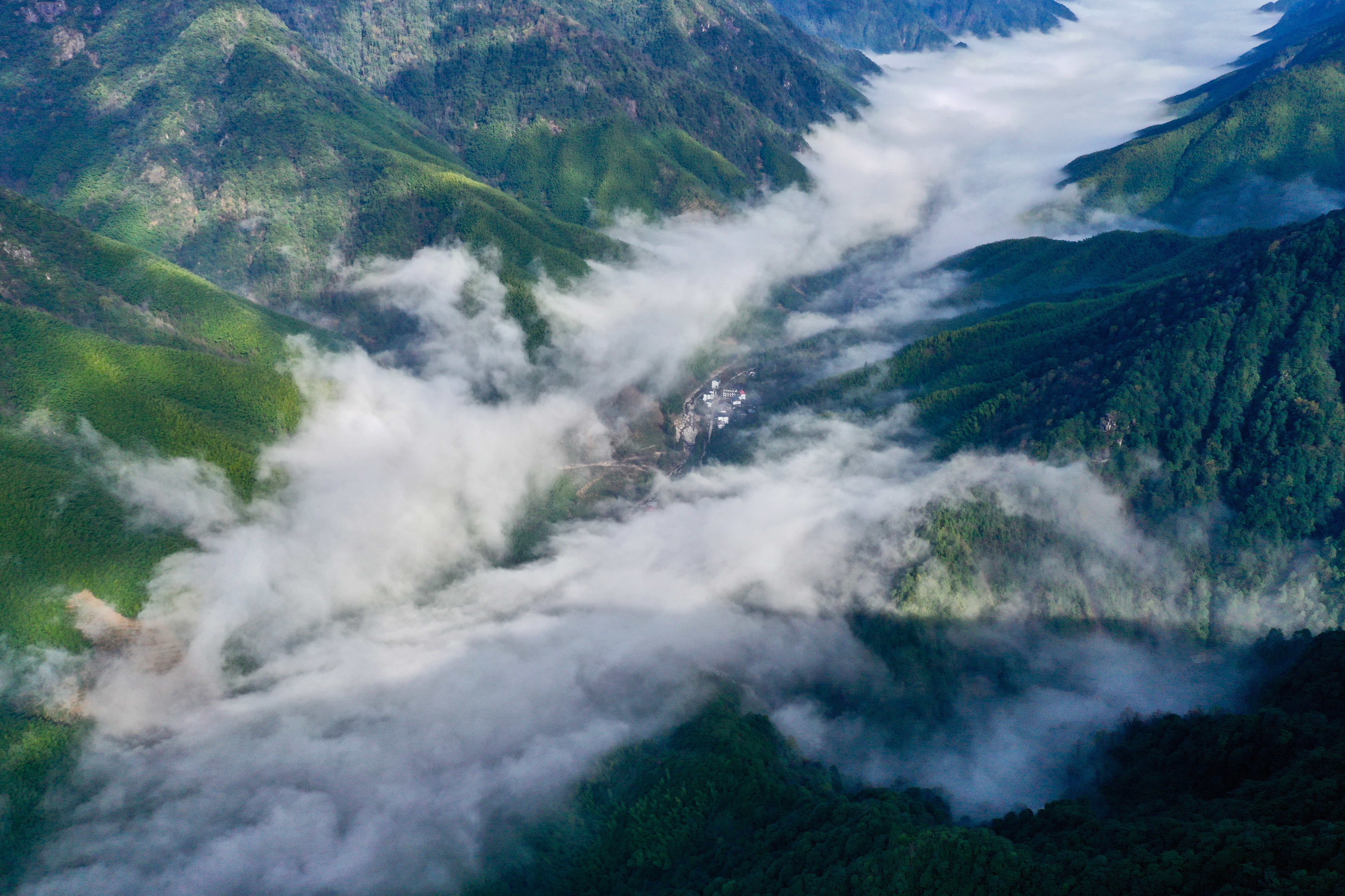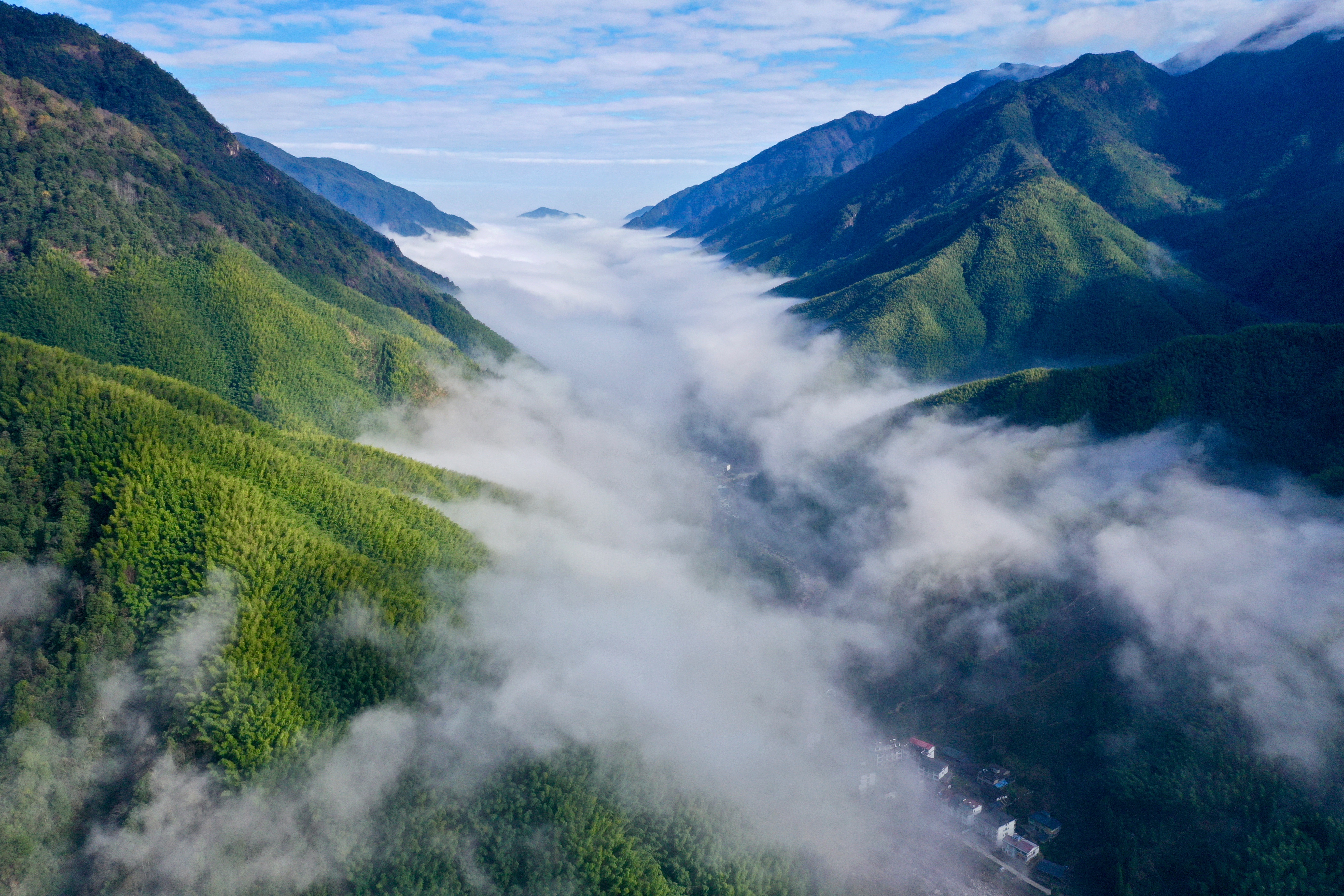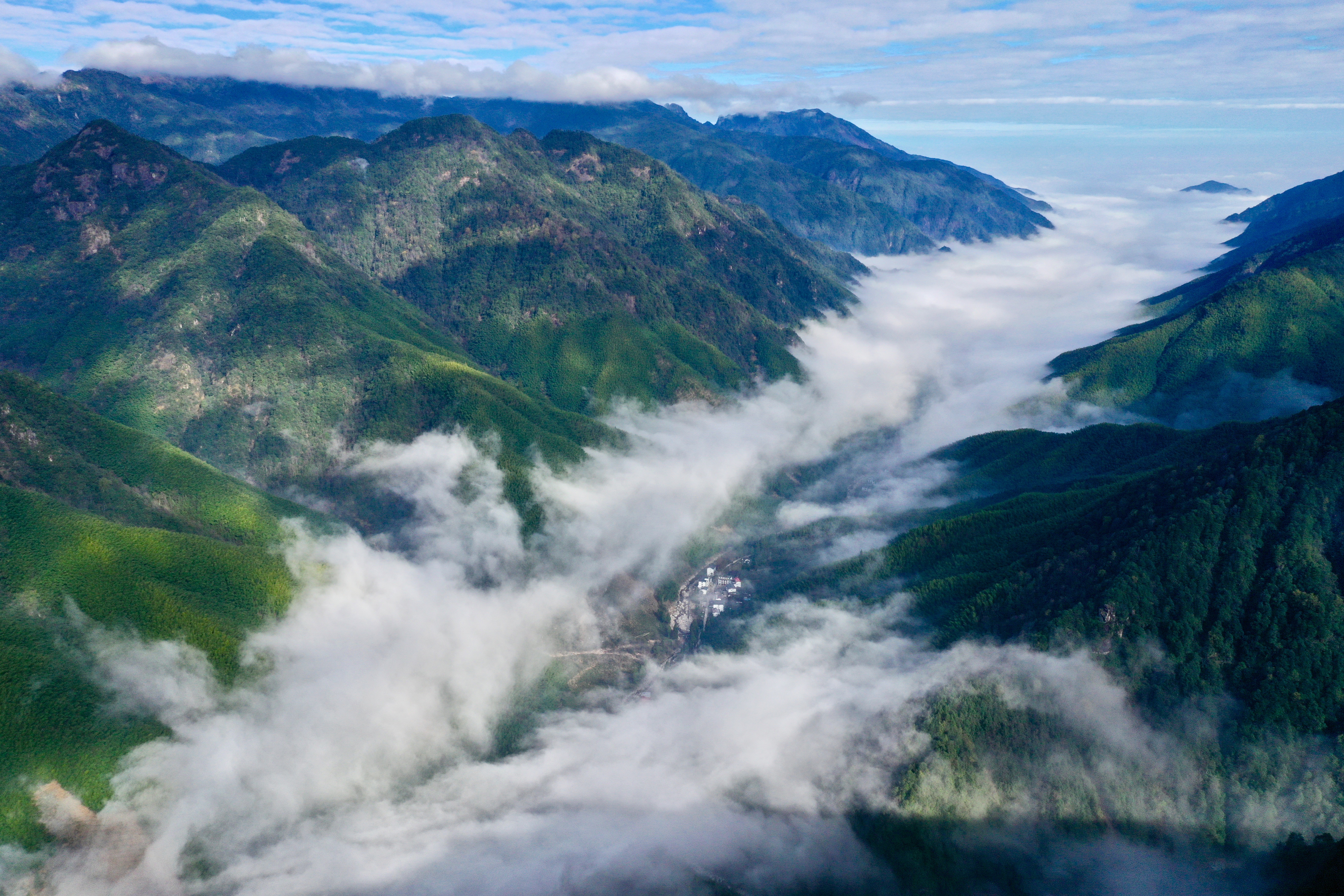 12月1日,武夷断裂带峡谷内云雾缭绕,村庄若隐若现(无人机照片)。