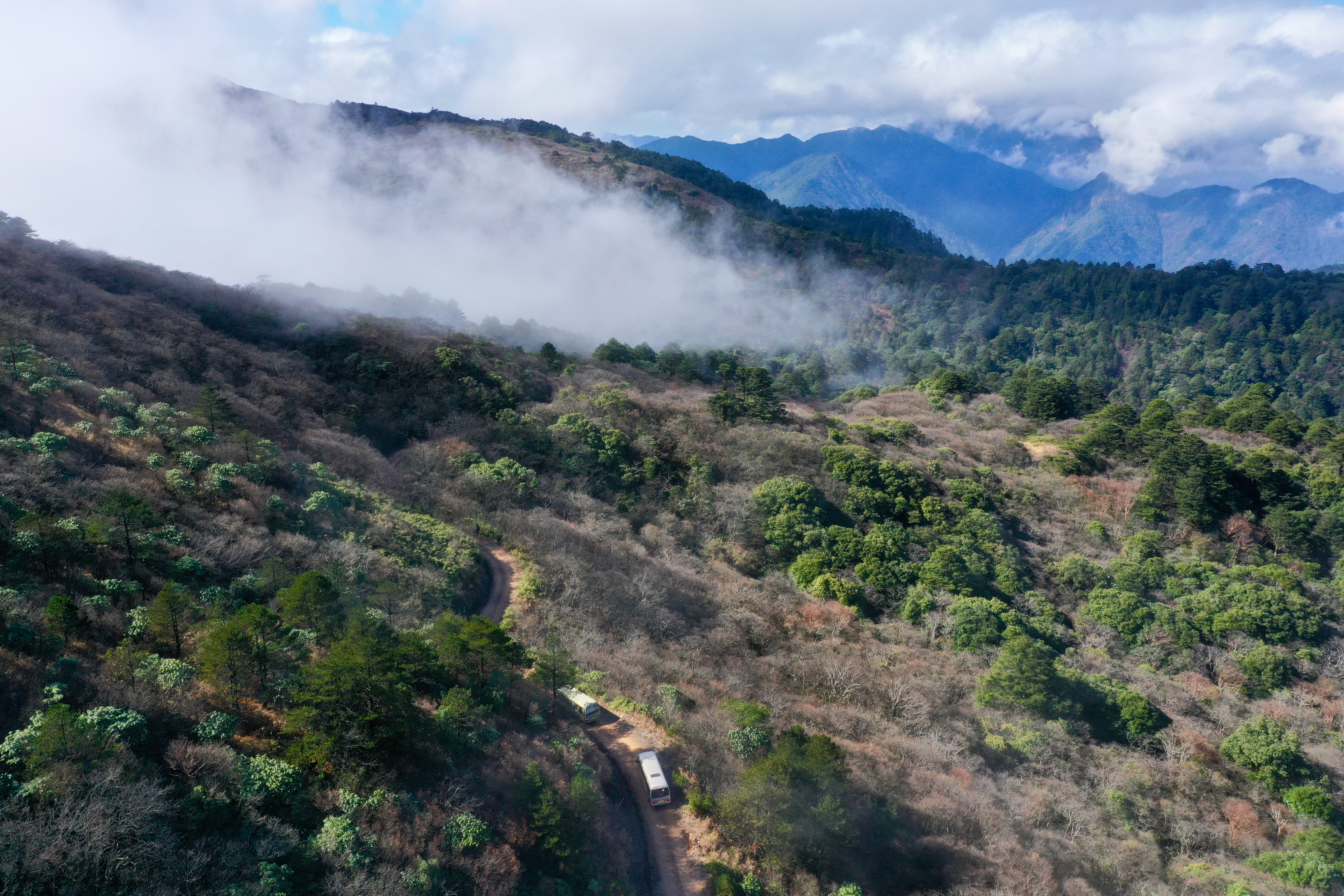 12月1日,车辆行驶在云雾缭绕的武夷主峰黄岗山丛林之中(无人机照片)。