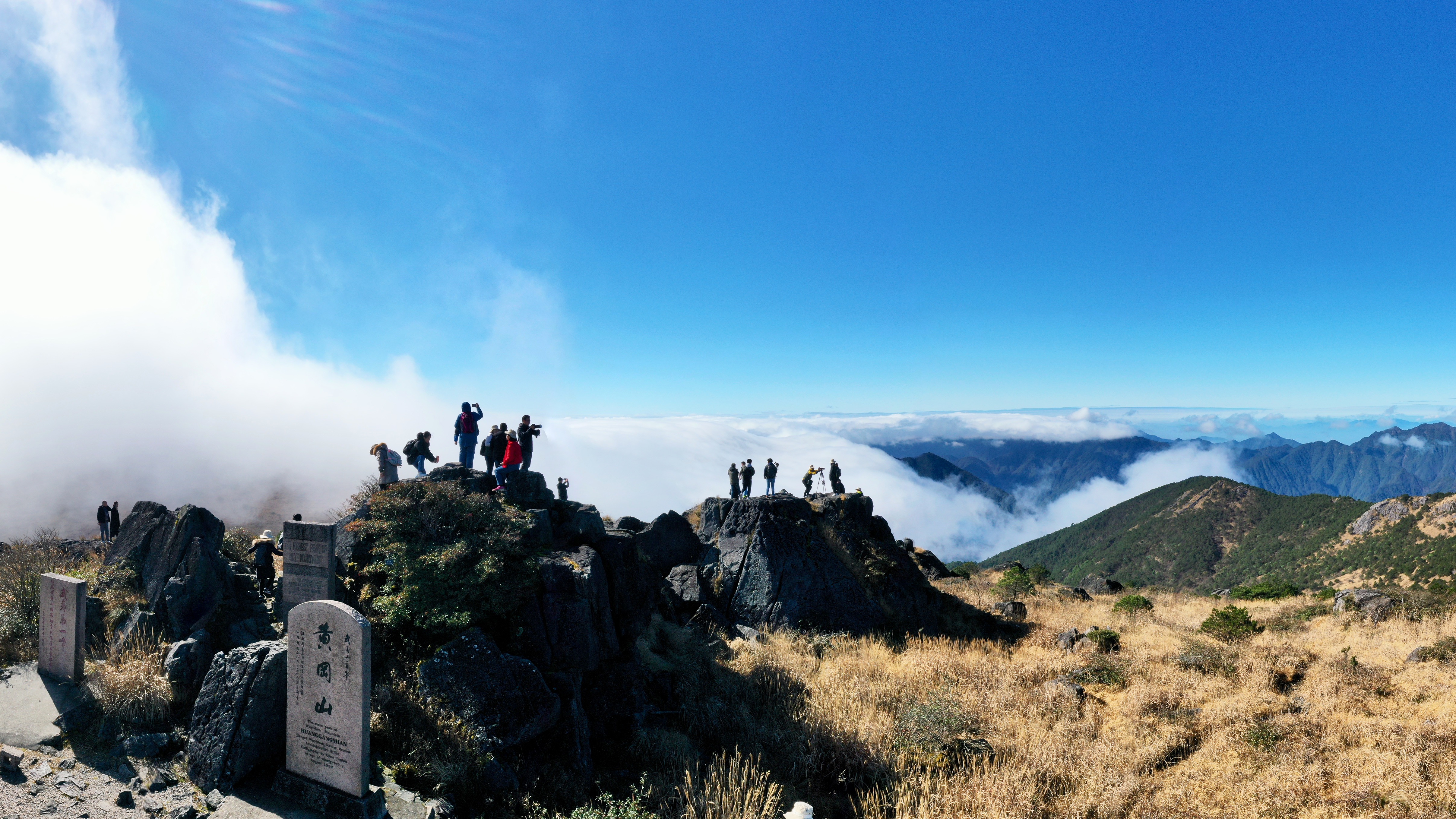 12月1日,人们在云雾缭绕的武夷主峰黄岗山顶参观(无人机照片)。