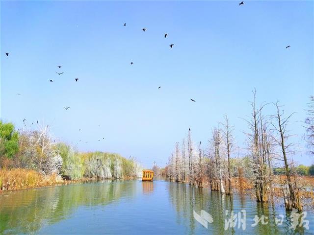 初冬的朱湖国家湿地公园环境幽雅,水清气爽。数以千计从黄河以北内蒙古区域远道回家的鸬鹚在湿地纵情嬉戏,围绕科考船只盘旋竞飞,表演着各种醉美的节目。