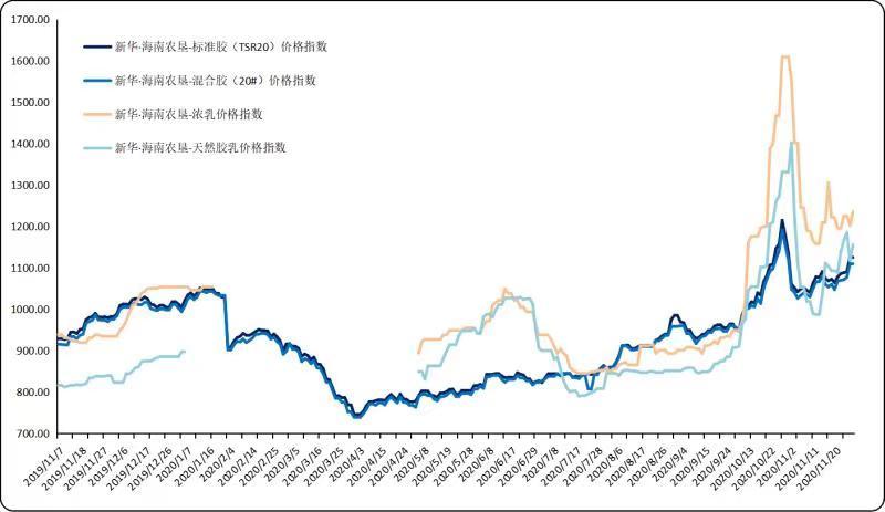 新华·海南农垦-天然橡胶系列价格指数显示,截至11月30日,标准胶(TSR20)价格指数报1125.74点,较11月23日(下同)上涨4.44%;混合胶(20#)价格指数报1108.79点,上涨3.85%。新华·海南农垦-浓乳价格指数报1235.10点,上涨3.37%;新华·海南农垦-天然胶乳价格指数报1156.43点,上涨6.3%。