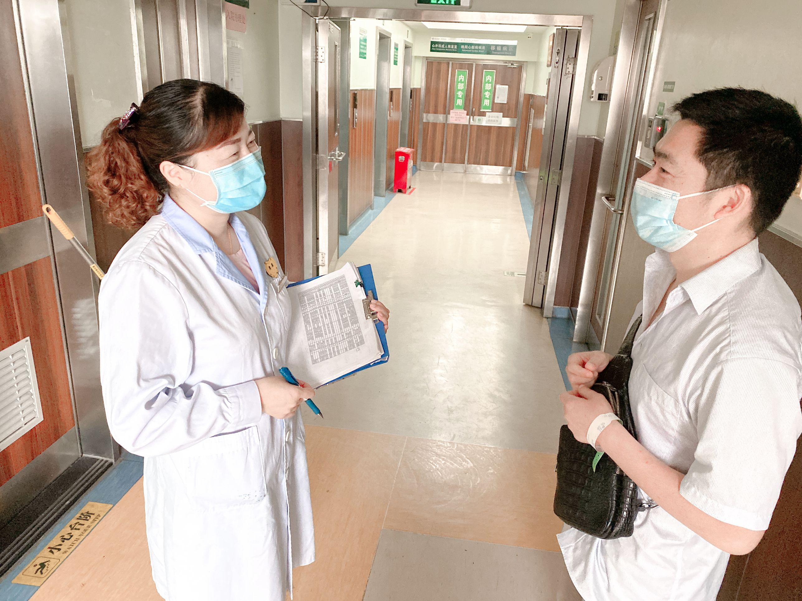 亚心医院医护社工的工作服领子是蓝色的。医务社工周红萍在向守候在ICU外的病人家属讲病人好转时,两人表情都很轻松。周红萍提供