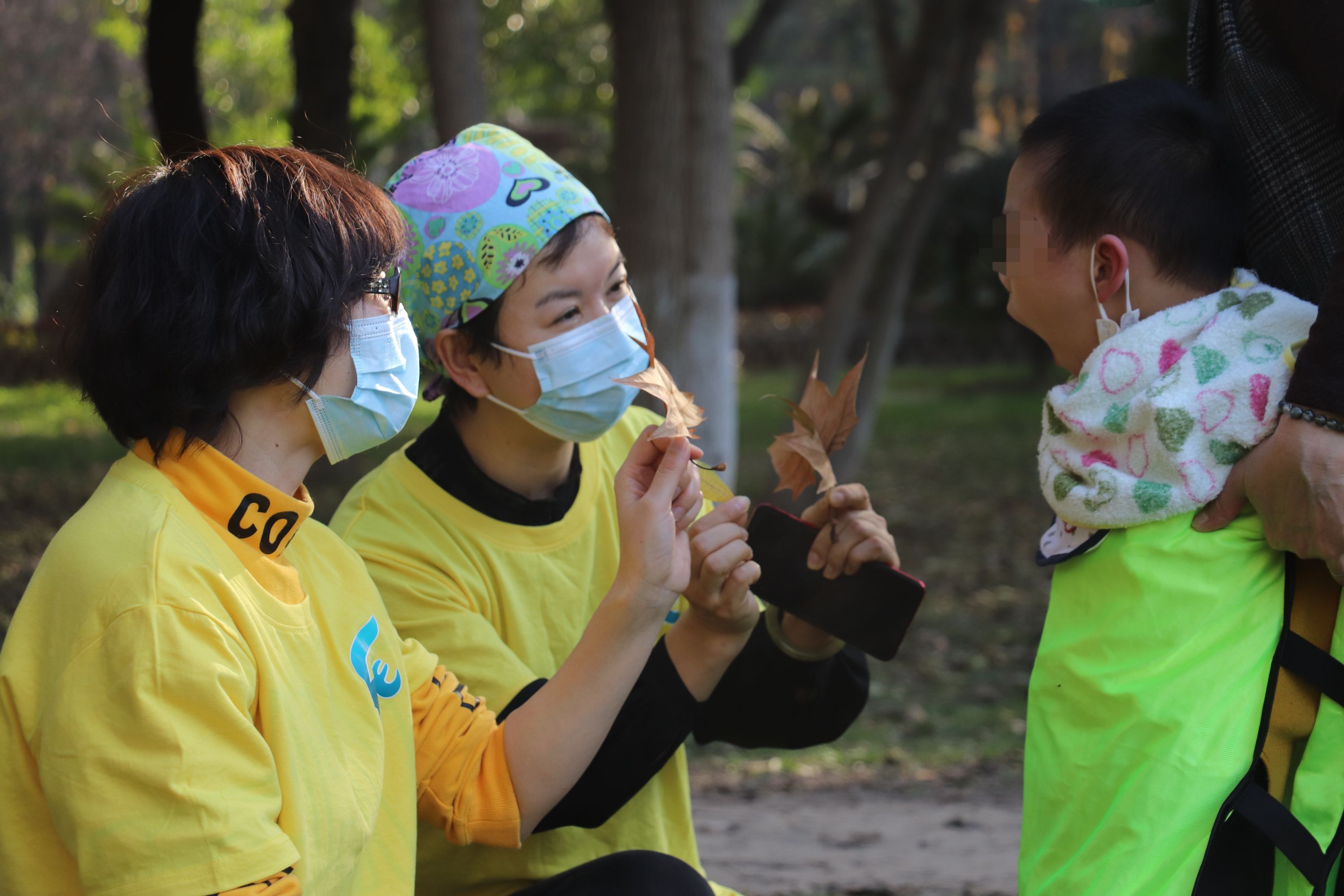 武汉儿童医院的医务社工将正在住院的有认知障碍的孩子带到公园,让他们感受秋天。任军提供