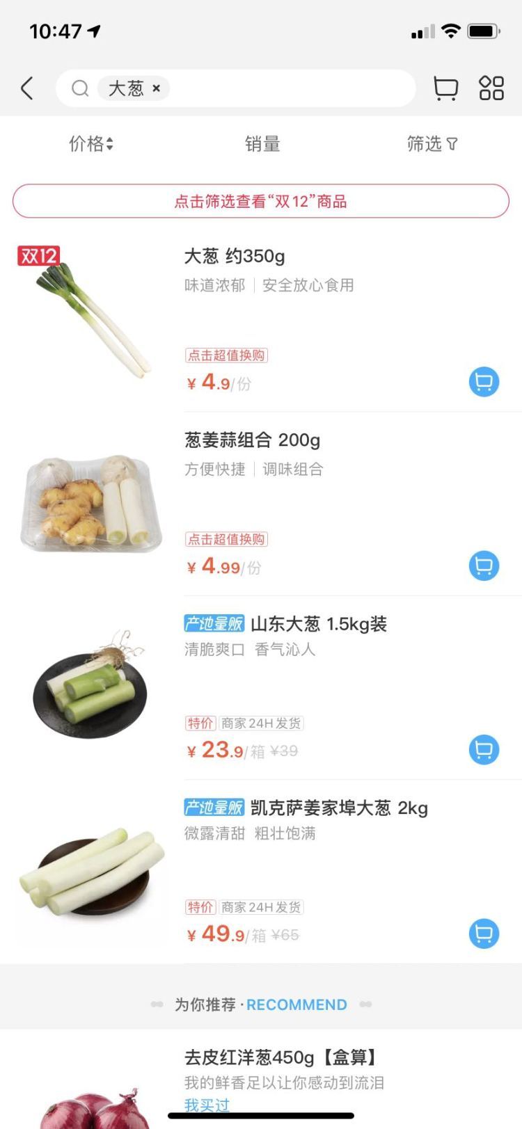 在盒马鲜生APP上,输入“葱”“姜”关键字,随机页面出现平台在售的相关商品,其中不乏标注有“特价”字样的产地量贩装。记者比对发现,山东大黄姜1kg装价格为19.9元/箱,相当于每斤不到10元。相较其线下店内折算17.25元/斤的山东莱芜生姜,不考虑品种因素,便宜不少。不过,另一款1.5kg山东大葱量贩装线上售价为23.9元/箱,相当于约7.9元/斤,而其线下店内售卖的产地山东青岛的大葱售价为4.9元/350g,折算价格为7元/斤。线上的“特价”量贩装显然就价格方面并没有更为实惠。