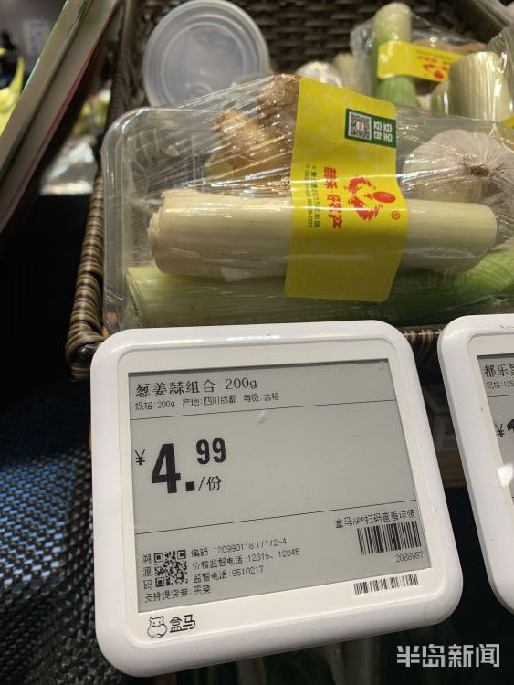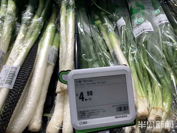 而在主打新经济概念,迎合年轻消费群体需求的盒马鲜生,线下门店内,产地山东青岛的大葱同样预先分装出售。不过记者注意到,这里每份大葱的重量是固定的,为350g,价格为4.9元每份。按此价格核算,每斤为7元。