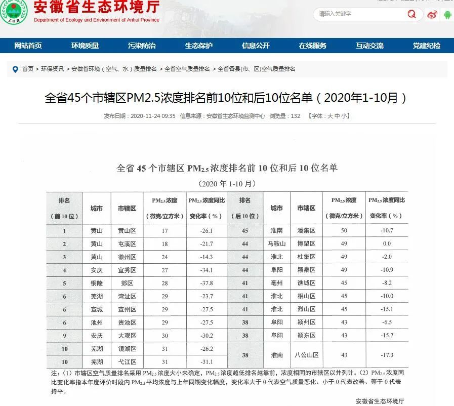 省生态环境厅日前公布前十月《全省45个市辖区PM2.5浓度排名前10位和后10位名单》。黄山市黄山区、屯溪区、徽州区排名前三位,其中黄山区空气质量最好,PM2.5浓度为17微克/立方米。