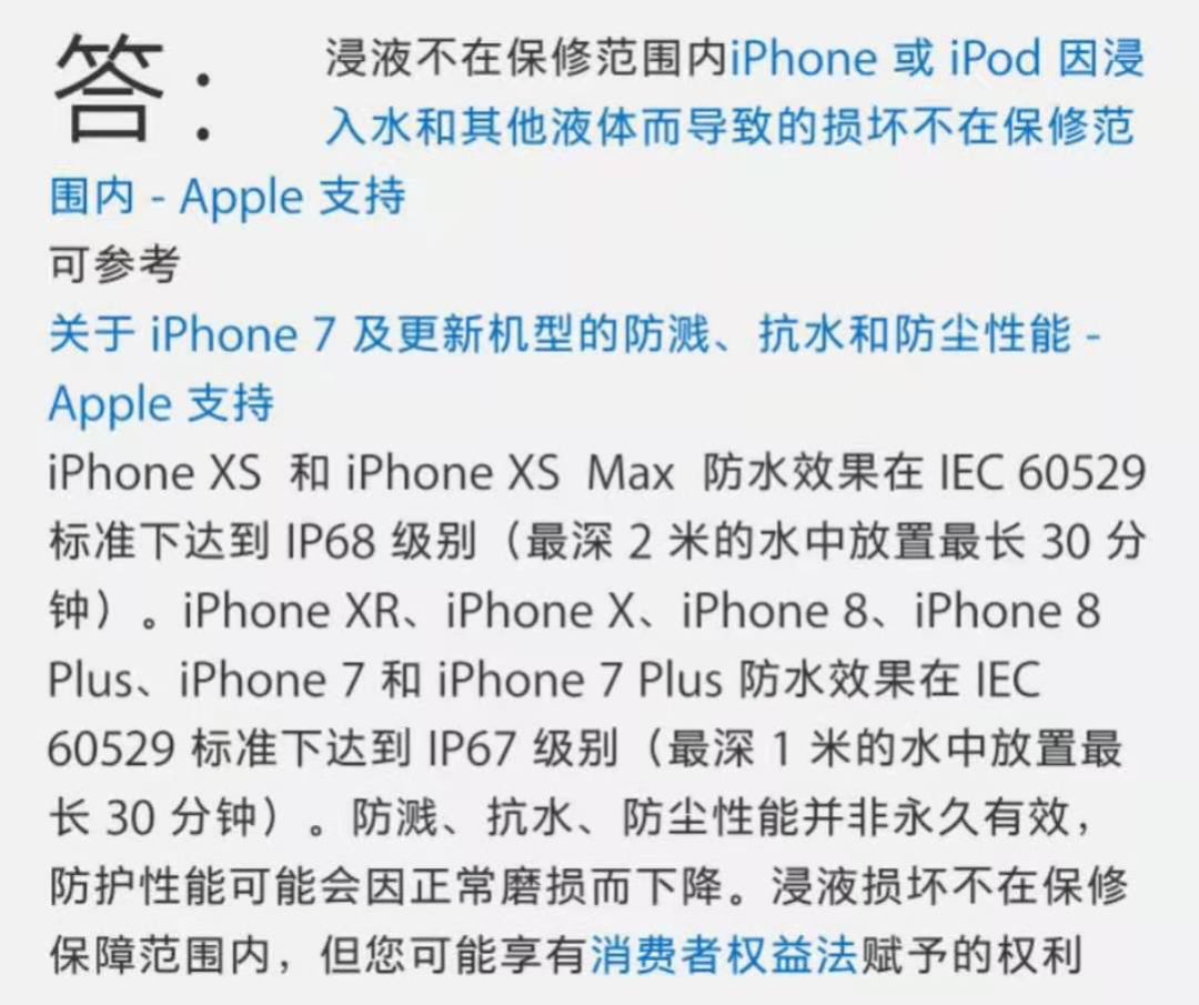 苹果回复称:“iPhone XS 和iPhone XS Max防水效果在IEC 60529 标准下达到IP68 级别(最深2米的水中放置最长30分钟)。iPhone XR、iPhone X、iPhone 8、iPhone 8 Plus、iPhone 7 和iPhone 7 Plus 防水效果在IEC 60529 标准下达到IP67级别(最深1米的水中放置最长30分钟)。防溅、抗水、防尘性能并非永久有效,防护性能可能会因正常磨损而下降。浸液损坏不在保修保障范围内,但您可能享有消费者权益法赋予的权利。”