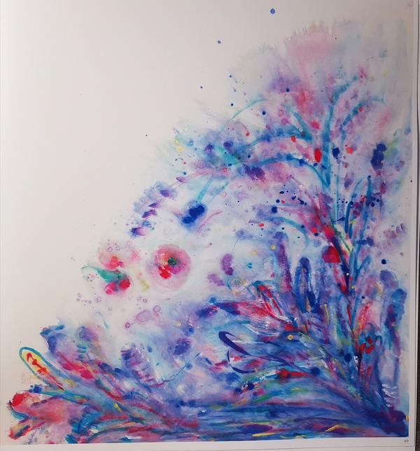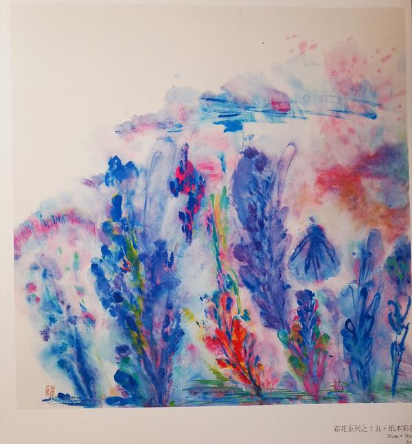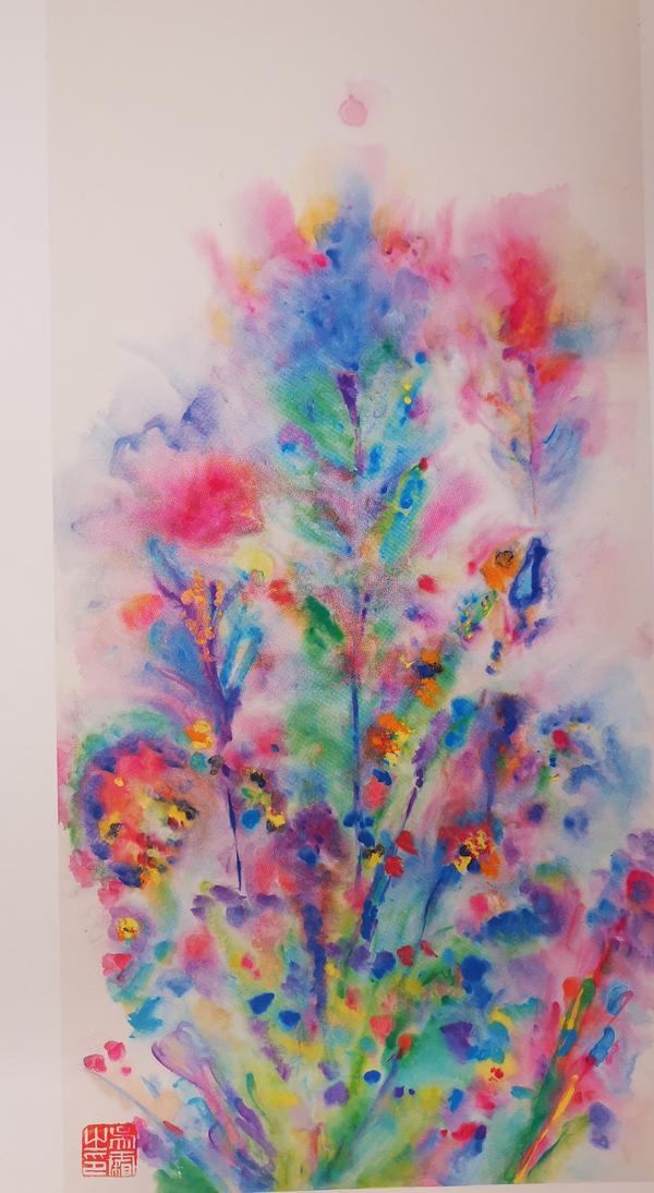近年来,吴霜在原先“彩墨”画法的基础上,探索将传统中国画的墨色运用到“花”主题的创作中。在她的笔下,或缤纷绚烂,或空明透彻,看花是花,但无法辨别哪是丁香,哪是牡丹,哪是月季。她用写意的艺术语言,在花蕾、花叶绽放的变化过程中,体会一花一世界,用灵动的线条、缤纷色彩表现大自然的微妙与意境。