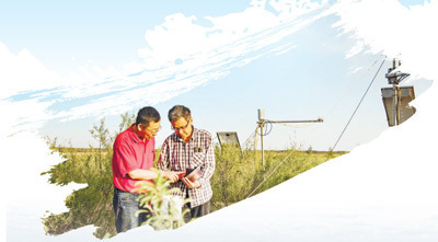 陕西神木市锦界镇圪丑沟村,张应龙(左)在查看水量平衡观测设施。新华社记者 陶 明摄