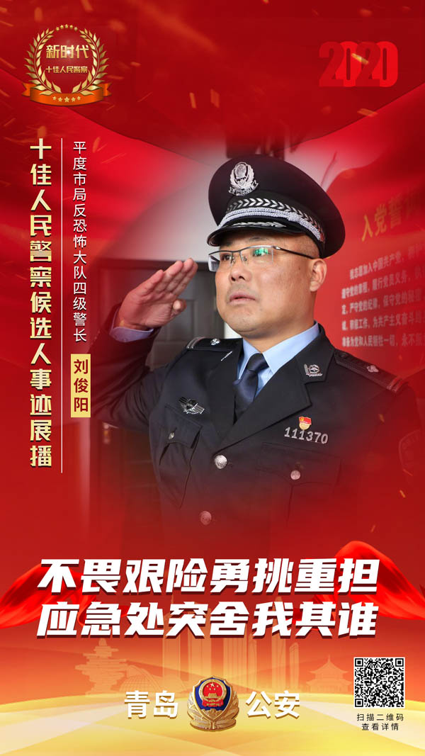 “既然选择了警察这个职业,关键时刻就要服从命令、冲锋在前……”这是平度市公安局反恐怖大队二中队负责人刘俊阳对特巡警队员经常说的一句话。今年45岁的刘俊阳主要负责特巡警应急队工作,承担着平度市的应急处突等任务。在疫情防控期间,刘俊阳带领队伍勇敢坚守在疫情防控一线,出色完成了各项工作任务。参加公安工作16年来,刘俊阳先后荣立过二等功一次,三等功两次,荣获第三届平度市“我最喜爱的十佳政法干警”荣誉称号。