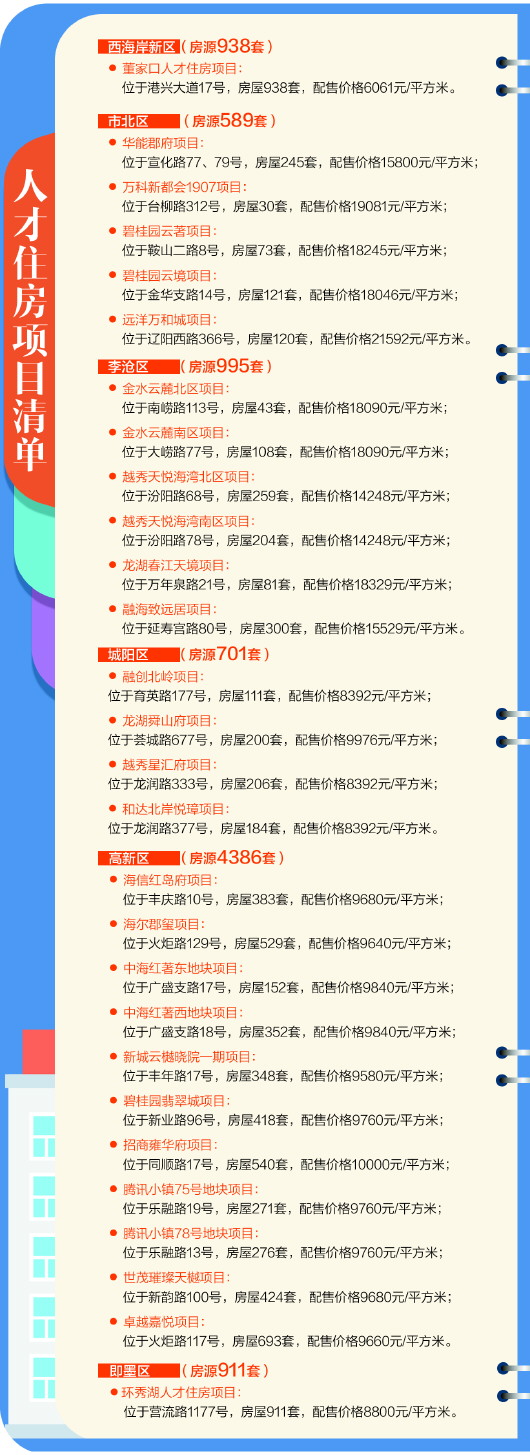 青岛市住房和城乡建设局局长陈勇:本次公开销售共涉及房源8520套,加上上半年已经配租配售的房源,今年我们供应的人才住房将超过1万套,是我市实施人才安居工程以来,房源供应力度最大的一年。此外,明年上半年我们还将继续推出约3000套人才住房房源。这些人才住房的持续供应,将有效稳定人才群体的购房预期,对青岛市引进人才、留住人才发挥积极作用。