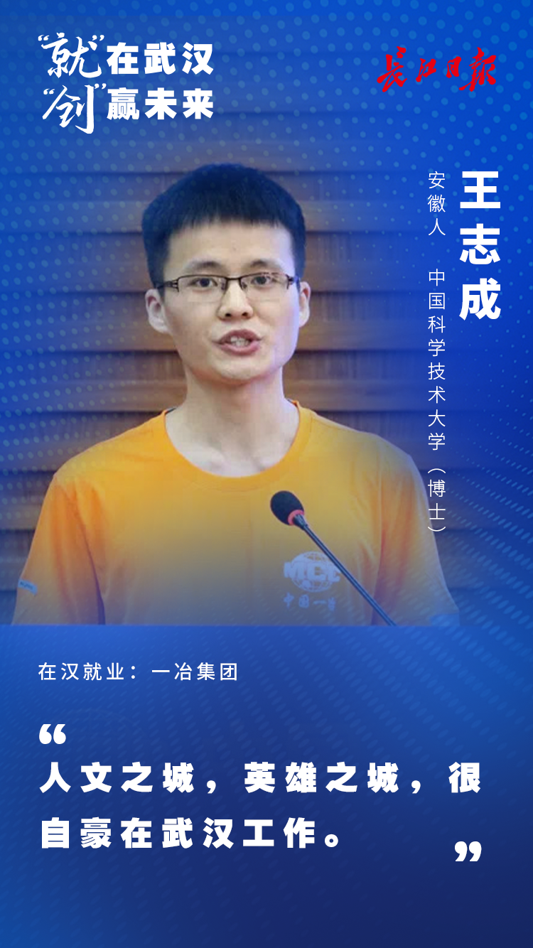 目前在一冶集团工作的王志成来自安徽,是毕业于中国科技大学的一名博士。他表示,武汉创业就业机会多,城市发展前景好,年轻人在这里很有发展前途。来武汉后,他去了省博物馆、江汉路步行街等地方游玩,感觉武汉是个人文气息和烟火气息并存的城市,也是一座英雄的城市。