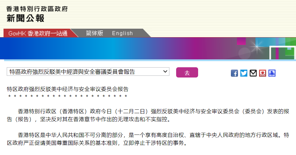 香港特别行政区政府12月2日发布新闻公报,强烈反驳美中经济与安全审议委员会报告。全文如下: